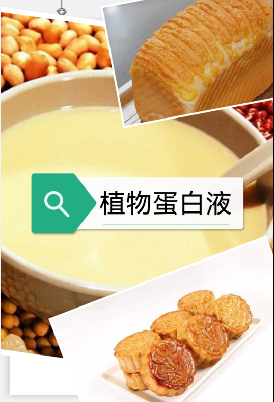 由水、大豆分離蛋白、植物油、葡萄糖等食品原料使用高溫技術生產的植物蛋白液,可代替蛋液作為光亮劑用于面包、月餅等烘烤類糕點食品表面,噴刷烘烤后使顏色光澤度更光亮。